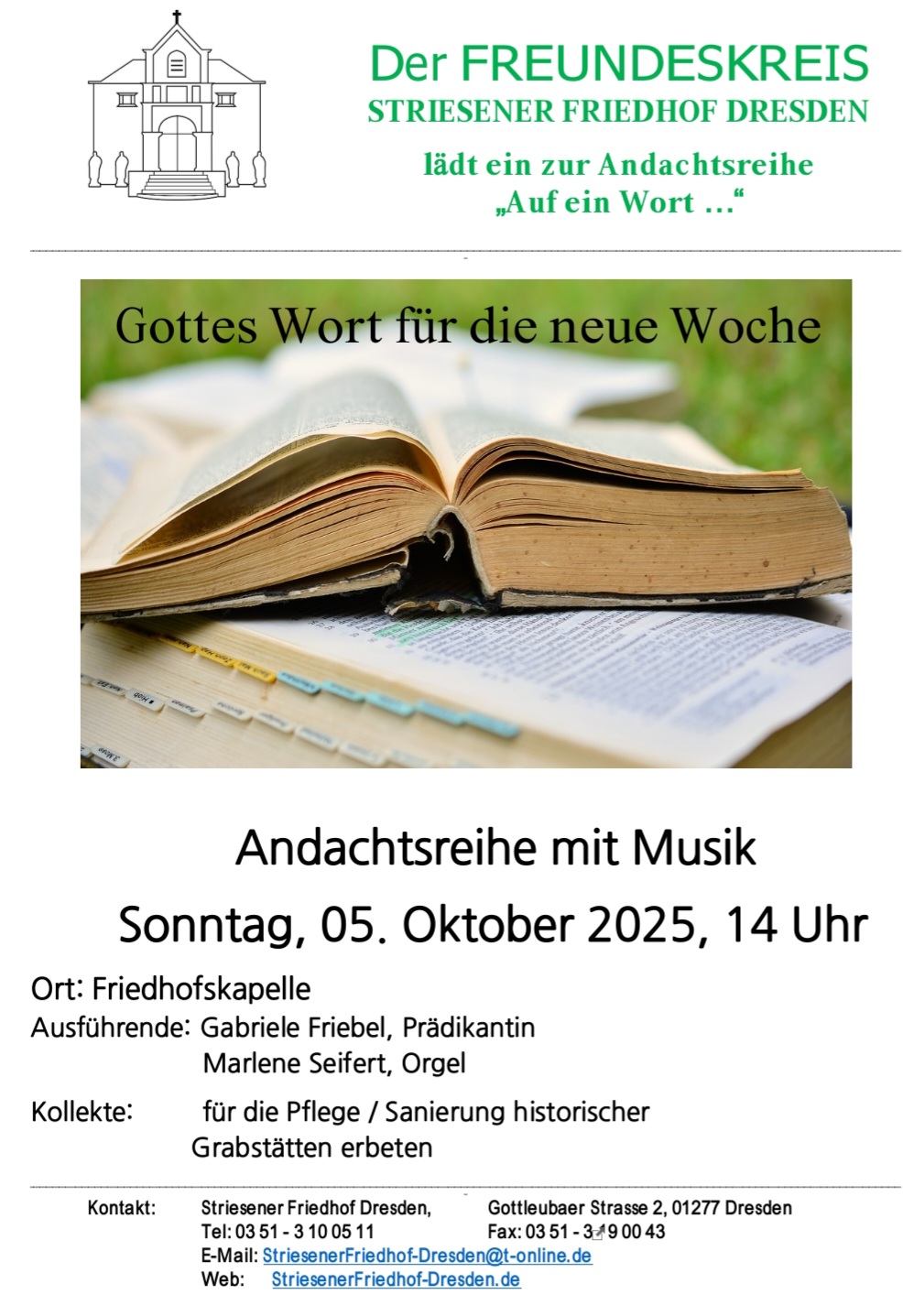 In der Andachtsreihe 2025 nehmen wir Gottes Wort mit in die neue Woche. Dafür sind fünf Sonntag-Termine ausgewählt. Die Andacht wird musikalisch begleitet. Wir […]